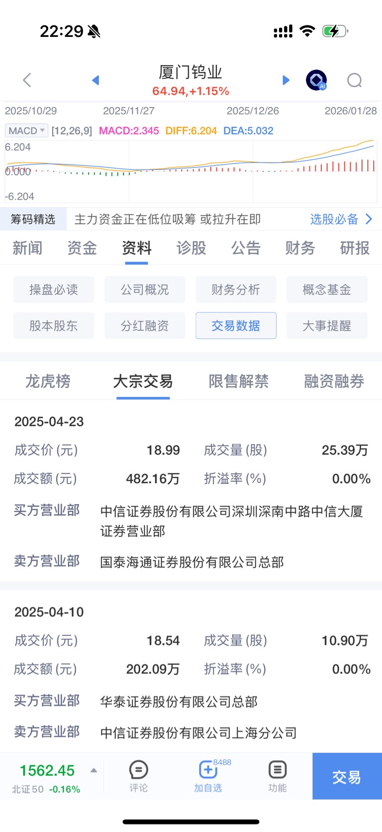 $厦门钨业(SH600549)$ 看到没有大宗交易没有折价率说明什么说明严重低估筹码交不出来只能真金白银的让韭菜散户交震仓