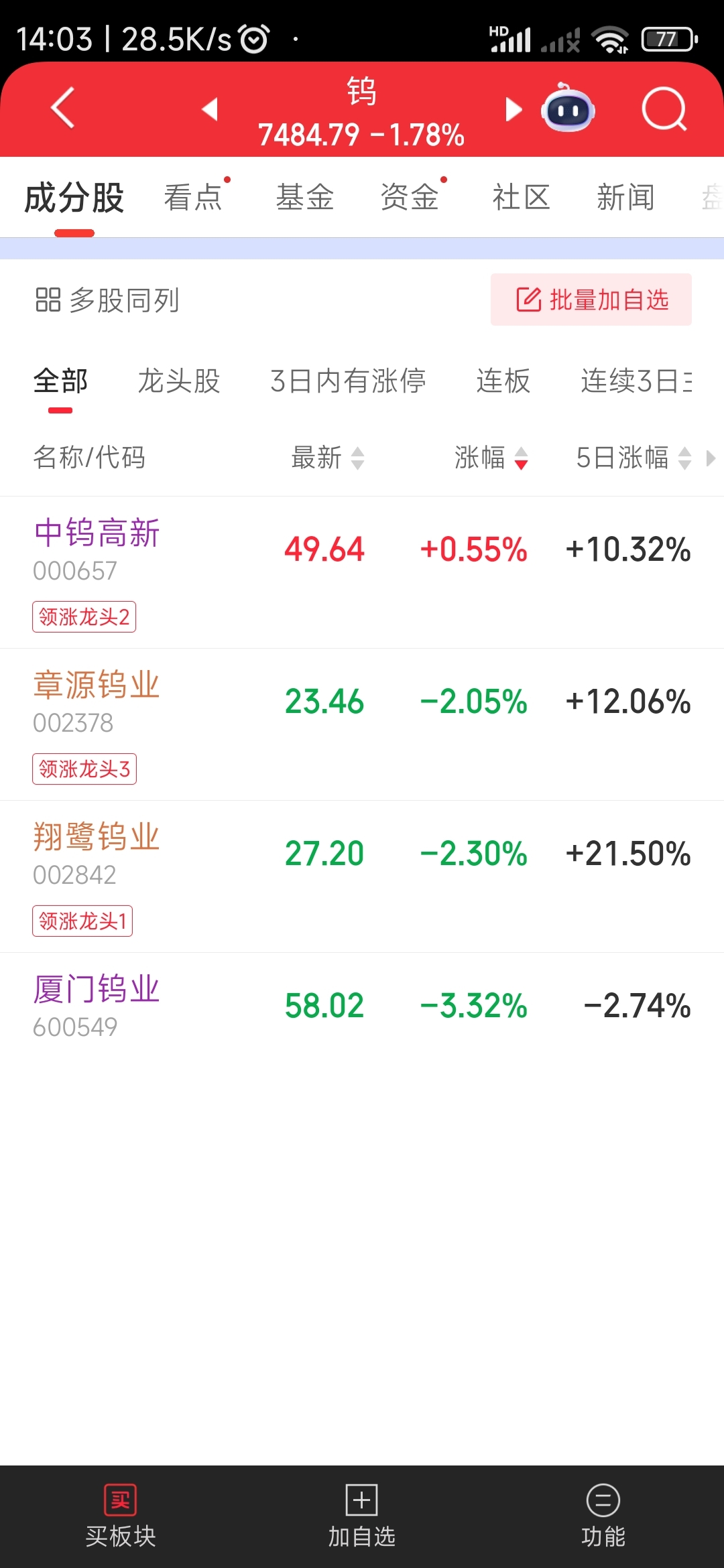 $厦门钨业(SH600549)$ 五日涨幅唯一一只跌的,其它三个都是十个点以上
