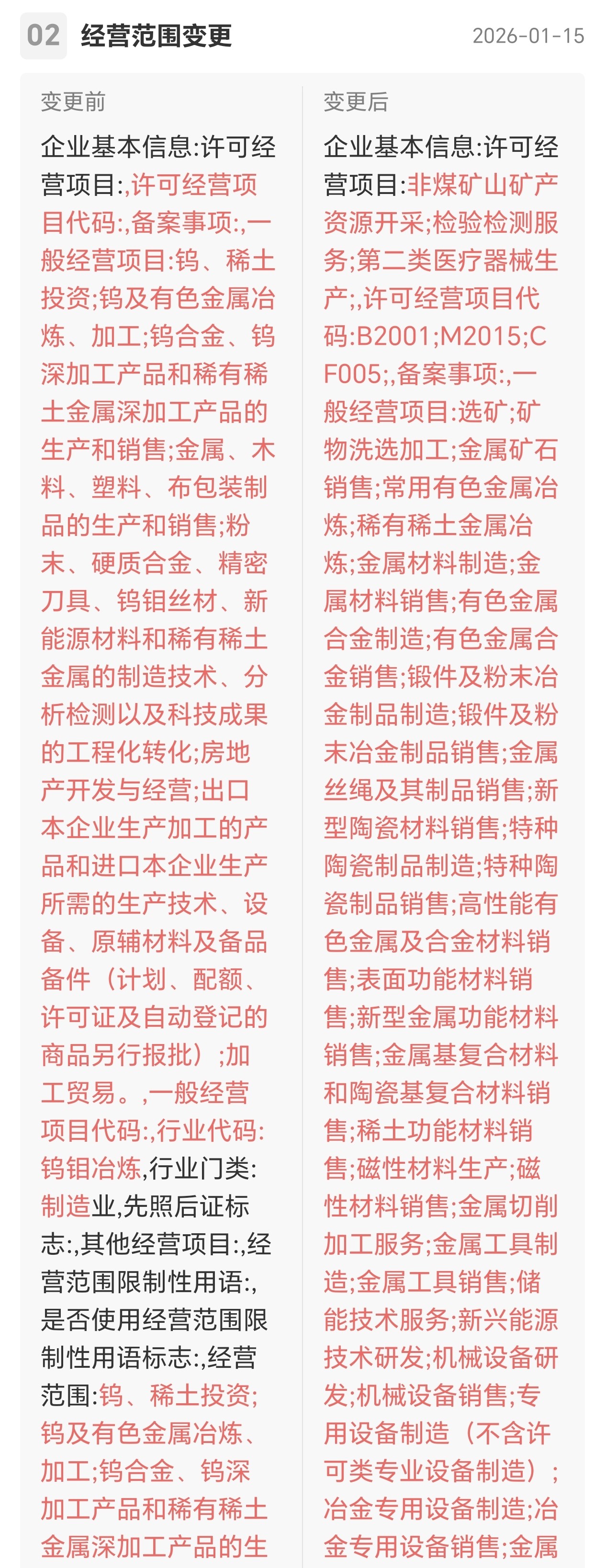 今天突然注意到厦钨2026年1月15日工商登记的经营范围变更公告,仔细分析后,这看似只是工商层面的调整,实则是公司彻底告别多元杂项、全面聚焦高端制造的战略宣言!删除房地产开发业务,新增电子专用材料、智能装备、工业机器人、储能技术服务等一众高端赛道布局,这份修订清单,藏着厦钨从“资源周期龙头”向“高端制造核心玩家”转型的核心逻辑,也标志着其三重护城河下的成长新周期正式开启。