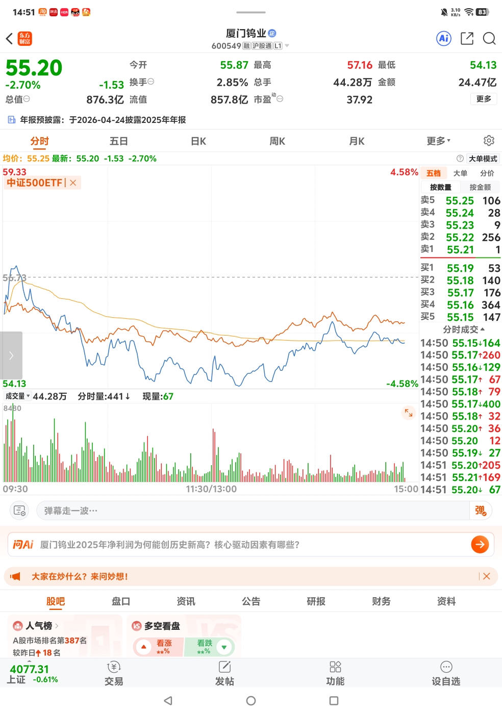 $厦门钨业(SH600549)$ 这股走势和南方中证500ETF的走势基本重合,说明它最近就是被中证500ETF打压的