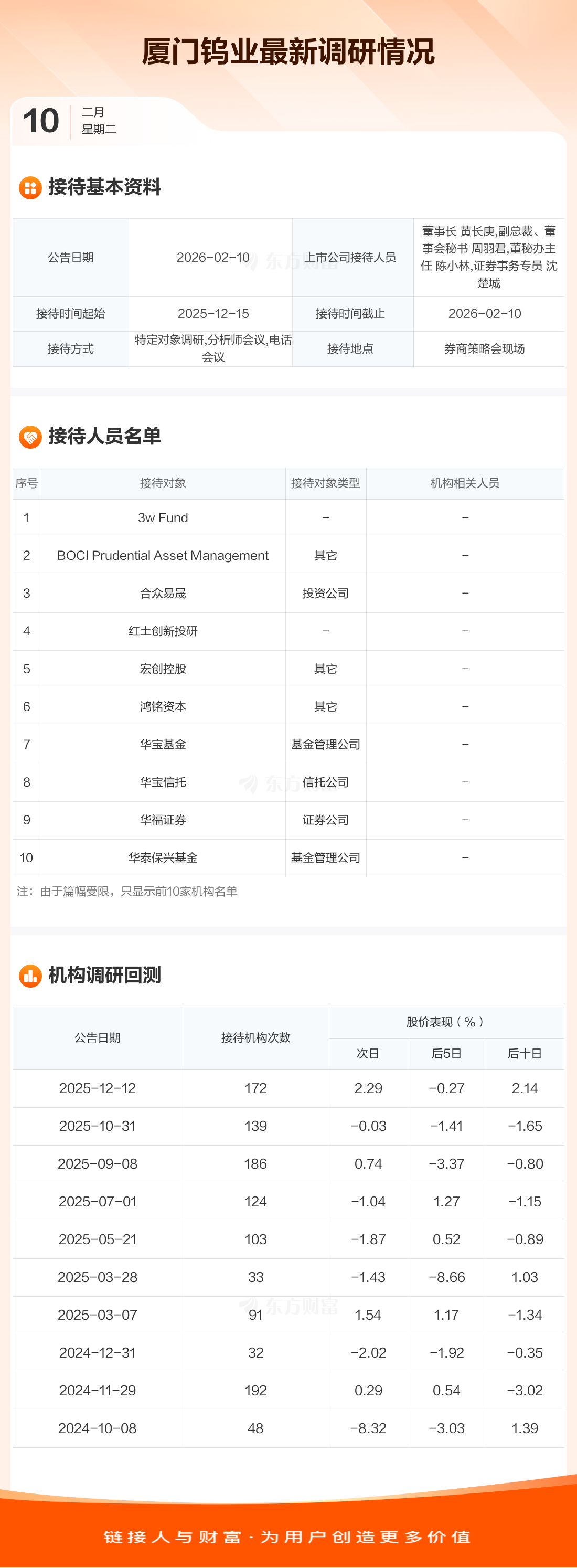 厦门钨业2月10日公告称,12月15日至2月10日接待3w Fund等171家机构调研。接待人员包括董事长 黄长庚,副总裁、董事会秘书 周羽君,董秘办主任 陈小林,证券事务专员 沈楚城。