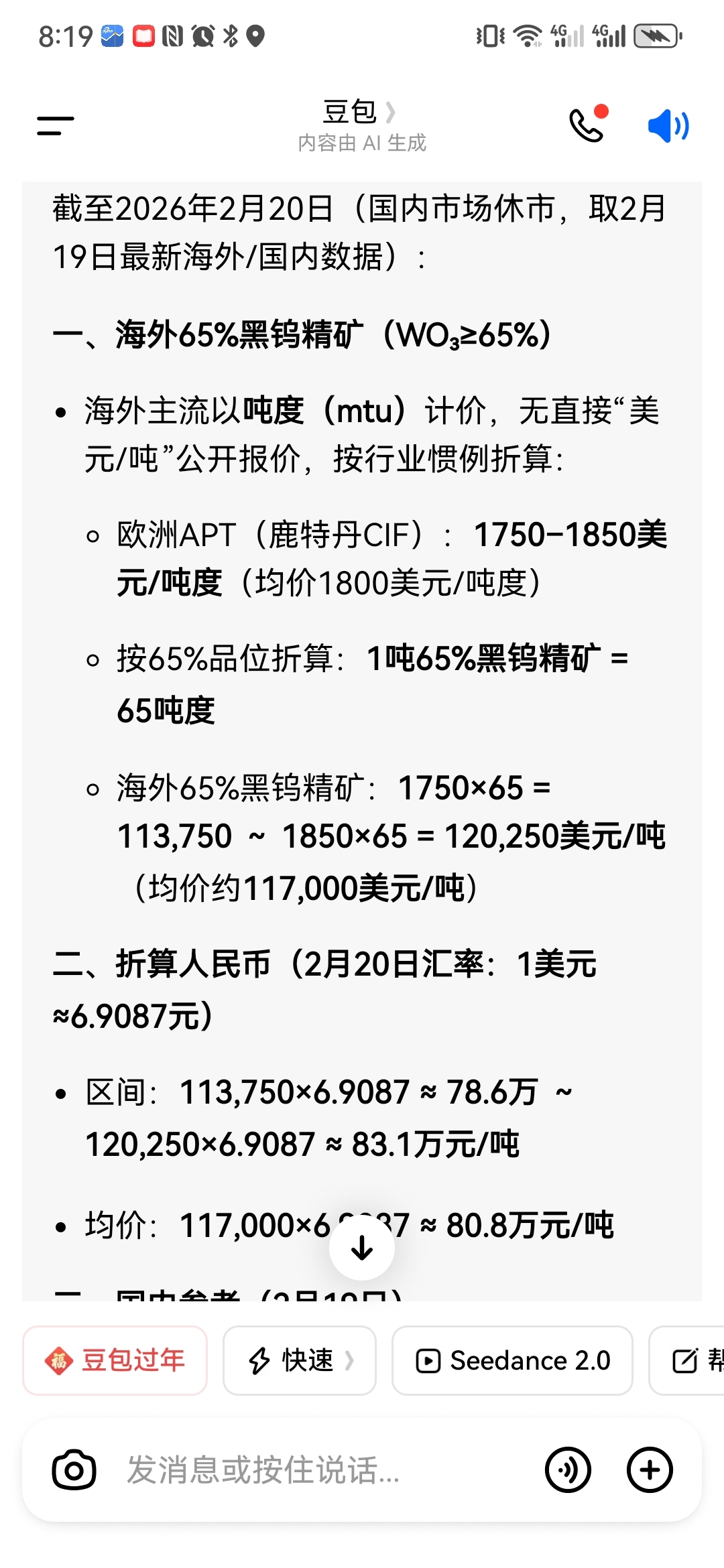 海外2月19日黑钨精矿65%,已达每吨79一83万/吨!
