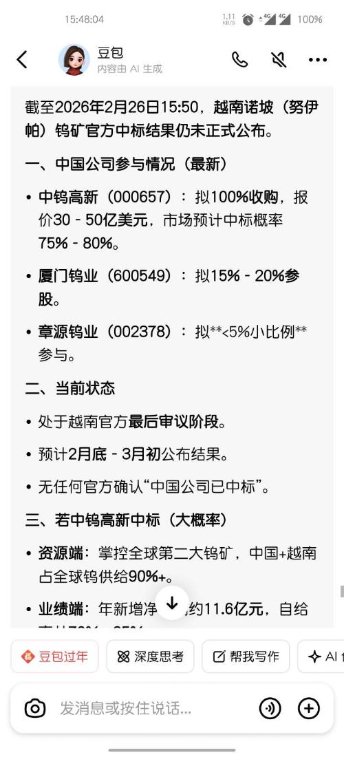 关于越南钨矿的中标公告,截至目前(2026年2月6日)尚未有最终结果公布,涉及越南诺坡钨矿的竞标仍处于进行阶段。12