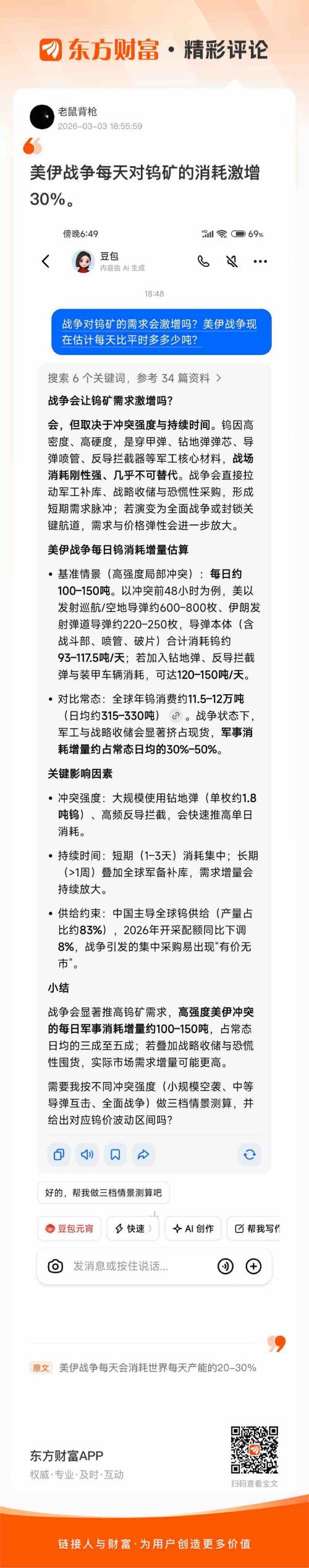 听起来靠谱//@老鼠背枪 : 美伊战争每天对钨矿的消耗激增30%。