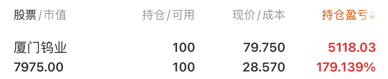 厦钨是真稳,就买了200股,到80减仓一半,持仓成本直接降一半,可惜之前买少了