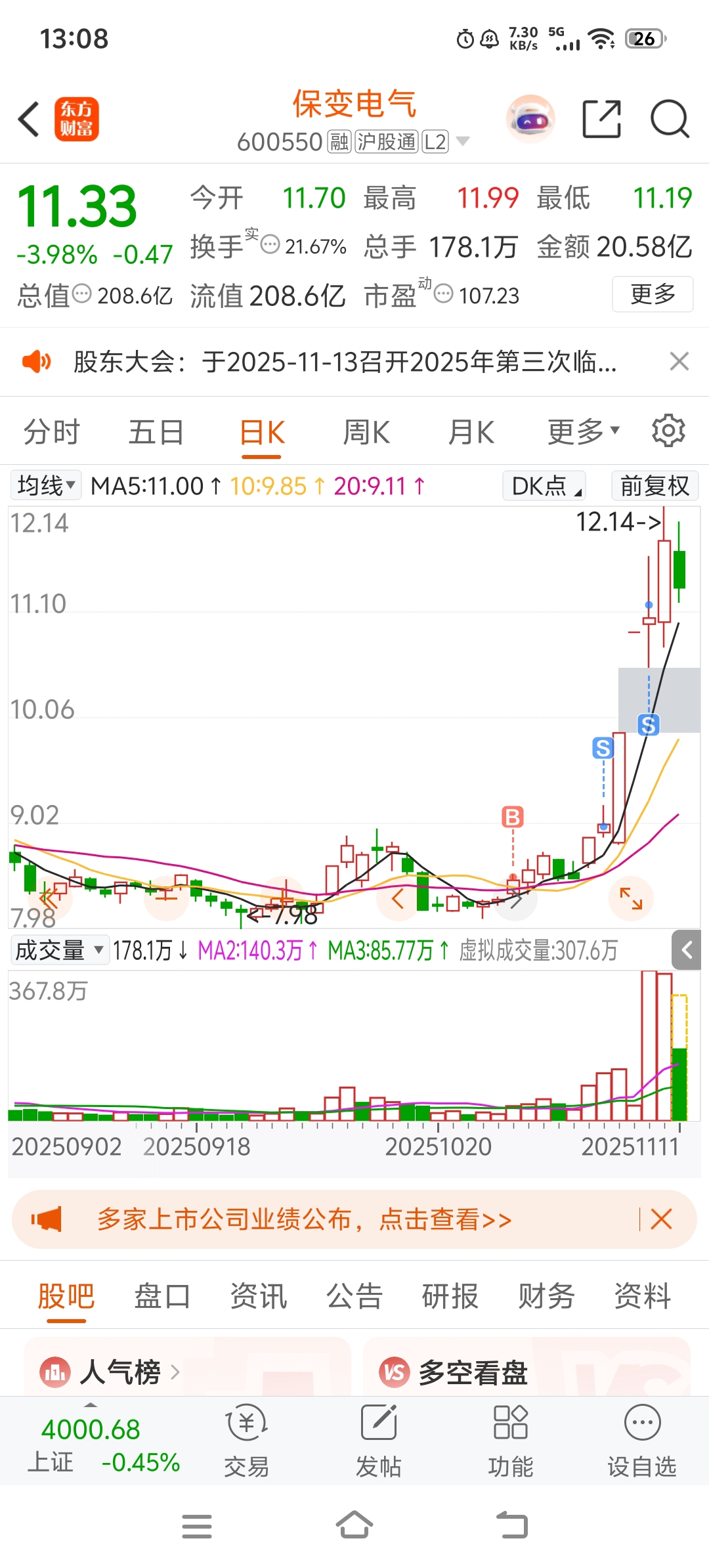 $保变电气(SH600550)$ 主力加油,20日线等你哟