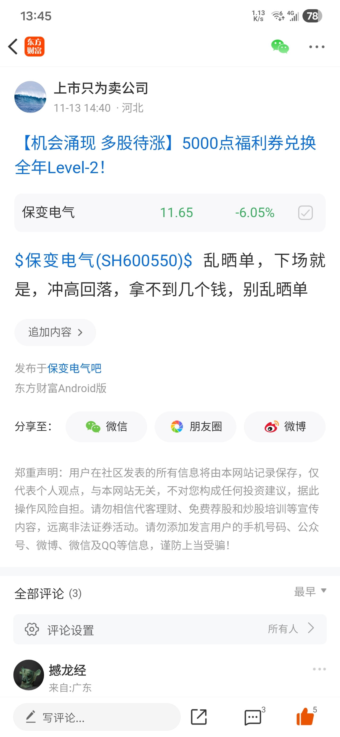 温馨提示: 1.根据《证券法》规定,禁止编造、传播虚假信息或者误导性信息,扰乱证券市场;2.用户在本社区发表的所有资料、言论等仅代表个人观点,与本网站立场无关,不对您构成任何投资建议。用户应基于自己的独立判断,自行决定证券投资并承担相应风险。《东方财富社区管理规定》