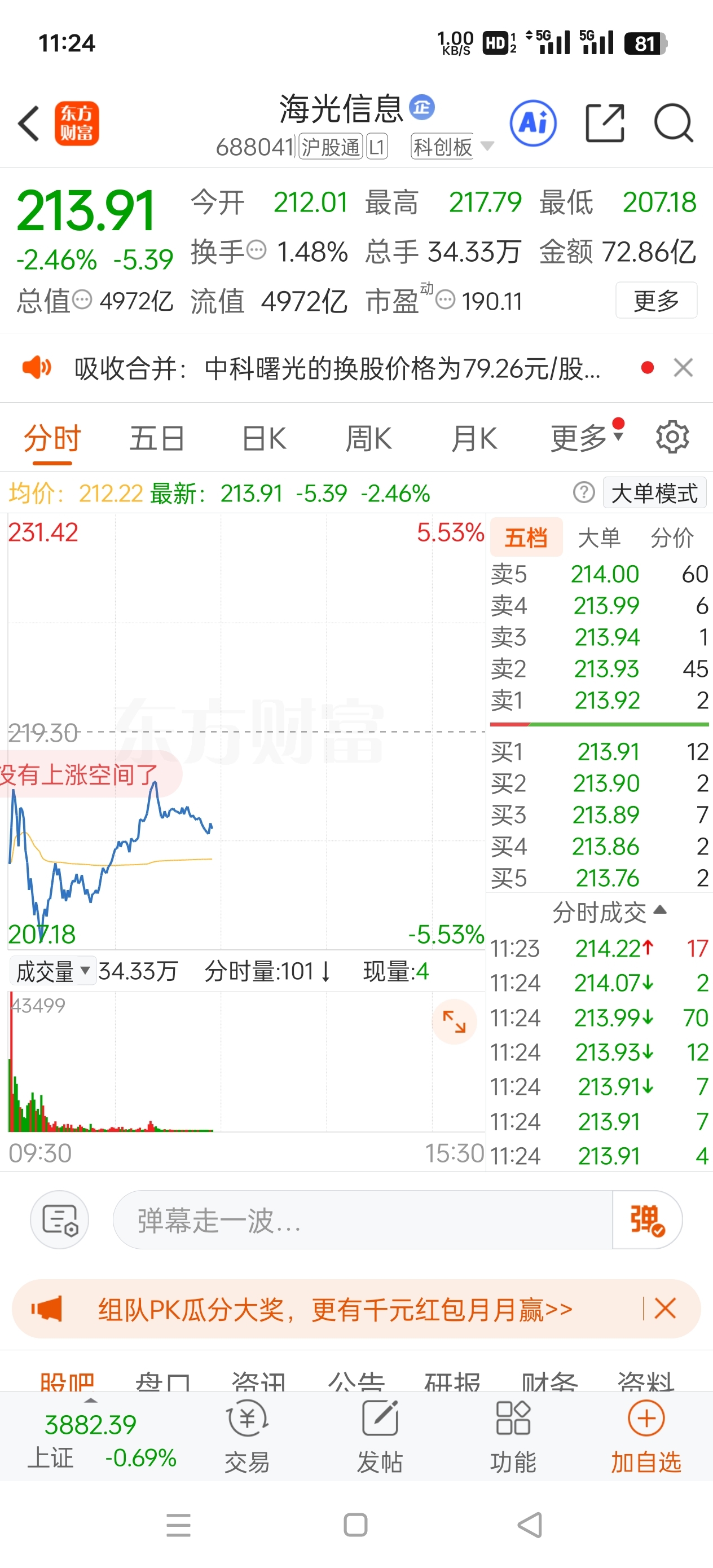 昨天出了那么大利空,都没有跌停,你跌的比人家还多。涨两天才两个点,早上开盘五分钟