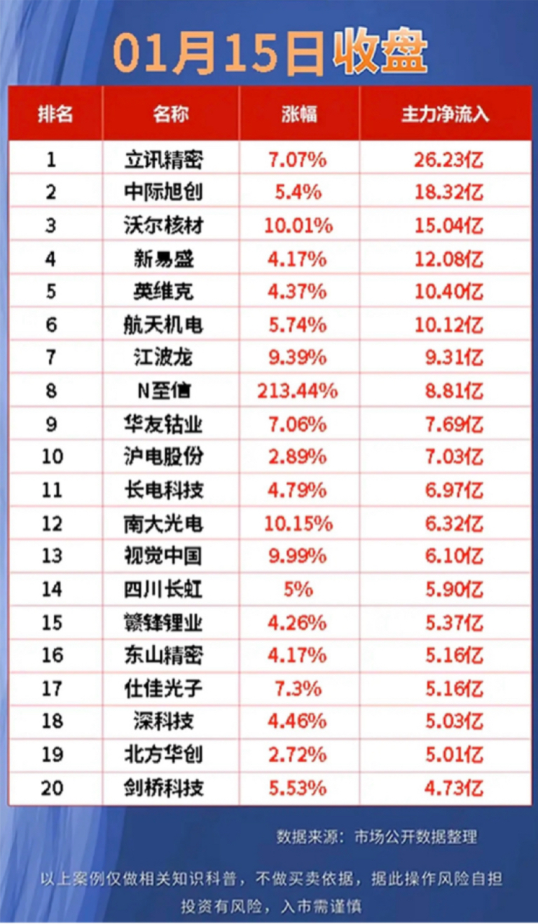 01月15日净流入前20名股票榜,快来一睹为快!"主力资金抢筹榜出炉!立讯精密、