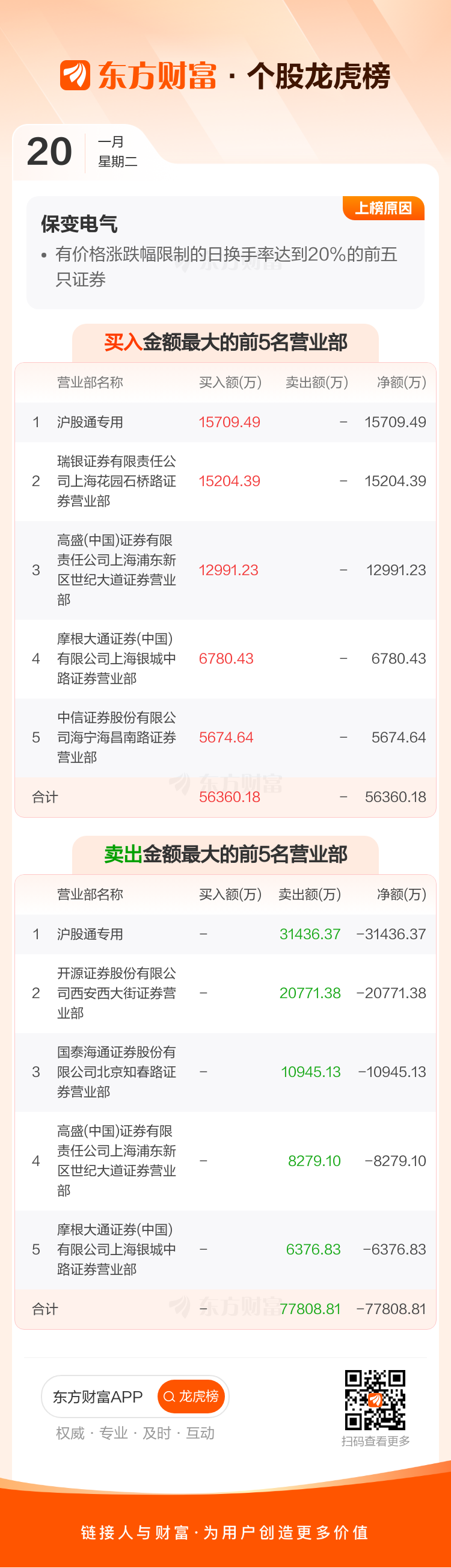保变电气(600550)龙虎榜数据(01-20)