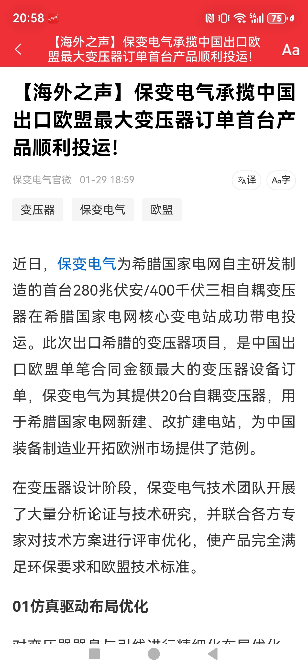 $保变电气(SH600550)$ 保变电气,牛啊!马斯克预言:“全球下一个紧缺品,将会是变压器”。美国、欧盟、印度都在为变压器短缺和电网升级发愁。 欧盟更是计划投入超过5800亿欧元来翻新旧电网。保变电气率先挺进希腊这个欧洲桥头堡,可以说是勇拔头筹,未来