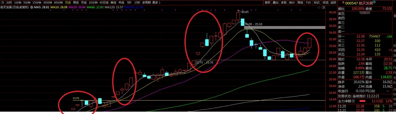航天大多数个股其实在走第三波了,有的更是走第四波了,如航天发展,第一波是福建,第二波,第三波是航天,现在第四波了。