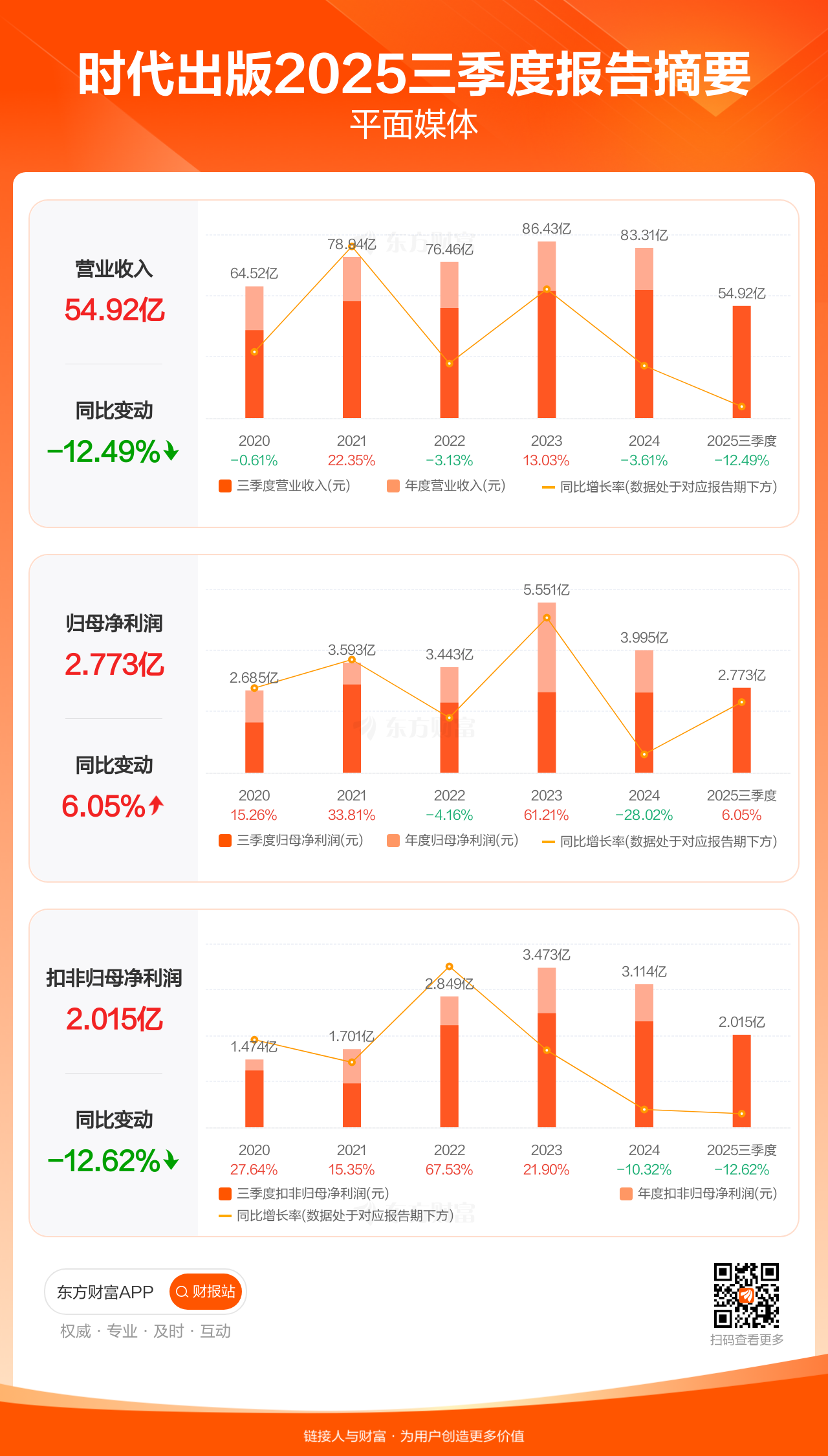 时代出版10月30日发布2025年三季报显示,公司前三季实现营业收入54.92亿元,同比下滑12.49%;归母净利润2.77亿元,同比增长6.05%;扣非归母净利润2.02亿元,同比下滑12.62%。