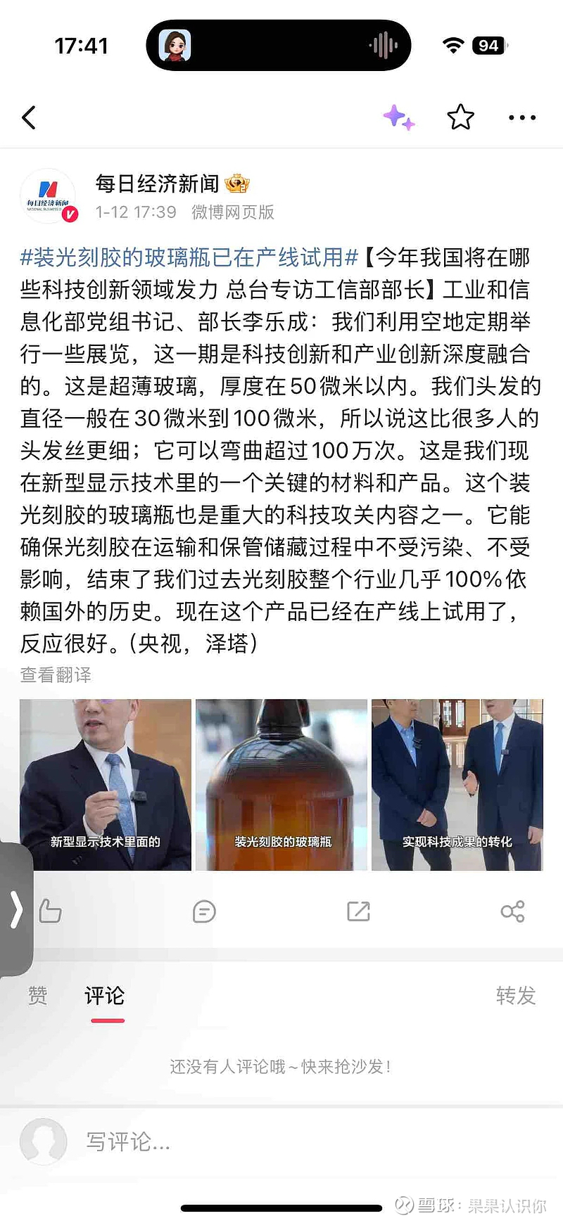 $凯盛科技(SH600552)$ $蓝思科技(SZ300433)$ 凯盛科技的光刻胶超薄玻璃瓶来了
