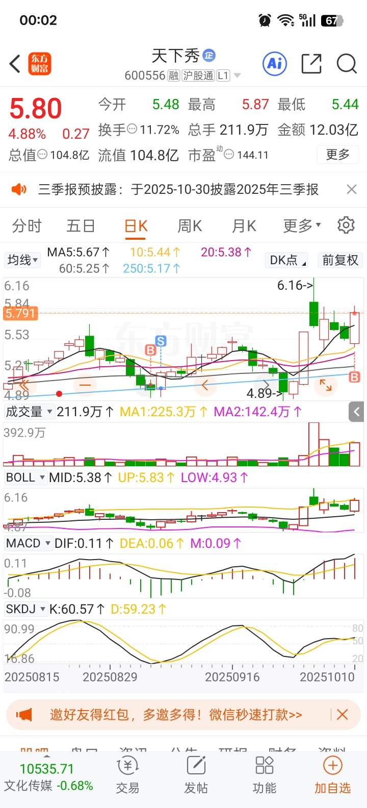$天下秀(SH600556)$ 再过几个小时就要开盘了,这票我实在想不到它不涨的理由,基本面还过得去,技术面已经呈现攻击状态,消息面关税基本上没有影响,本轮牛市基本上可以说没有涨过。就算要补张应该轮到它了。