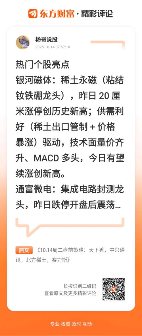 银河磁体:分享一只大黑马银河磁体!它可是国内稀土永磁行业的龙头企业,在粘结钕铁硼磁体领域实力非常强劲。这只股昨天直接20厘米涨停,一根长阳拔地而起,还顺便创下了历史新高,表现极为强势。它为什么这么猛?主要是供需两端的好消息都凑到一块儿了:国家强化稀土出口管制,加上稀土价格暴涨,这两个因素直接点燃了整个稀土永磁板块。银河磁体作为龙头,自然是带头冲锋。技术上看,它现在是量价齐升,MACD也在强势的多头区域,上涨趋势非常明确。今天它很有希望延续这个势头,继续向上冲,再创个新高完全有可能,绝对是重点关注的对象!
