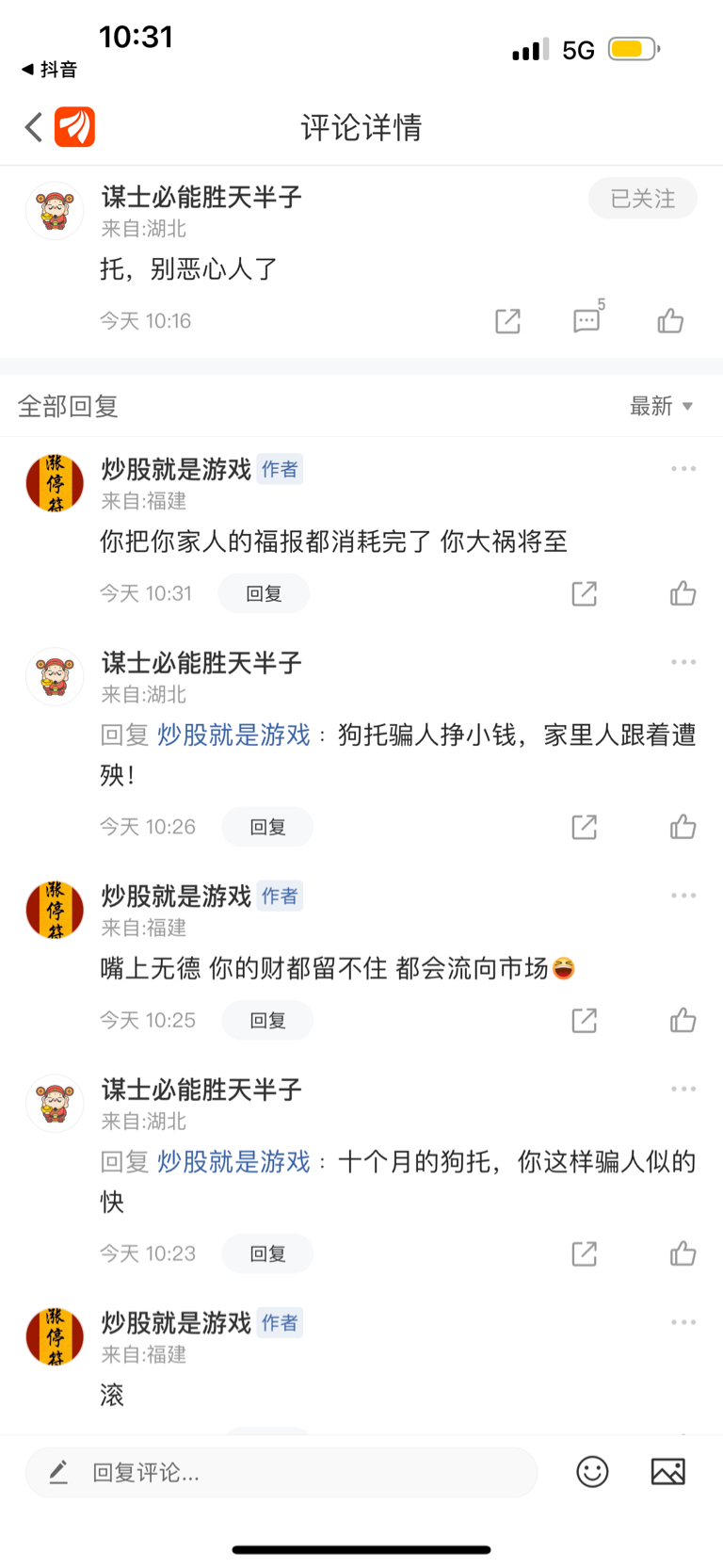 $天下秀(SH600556)$ 此人最低点劝人割肉 动不动攻击别人家人 人品差口德差 大祸将至