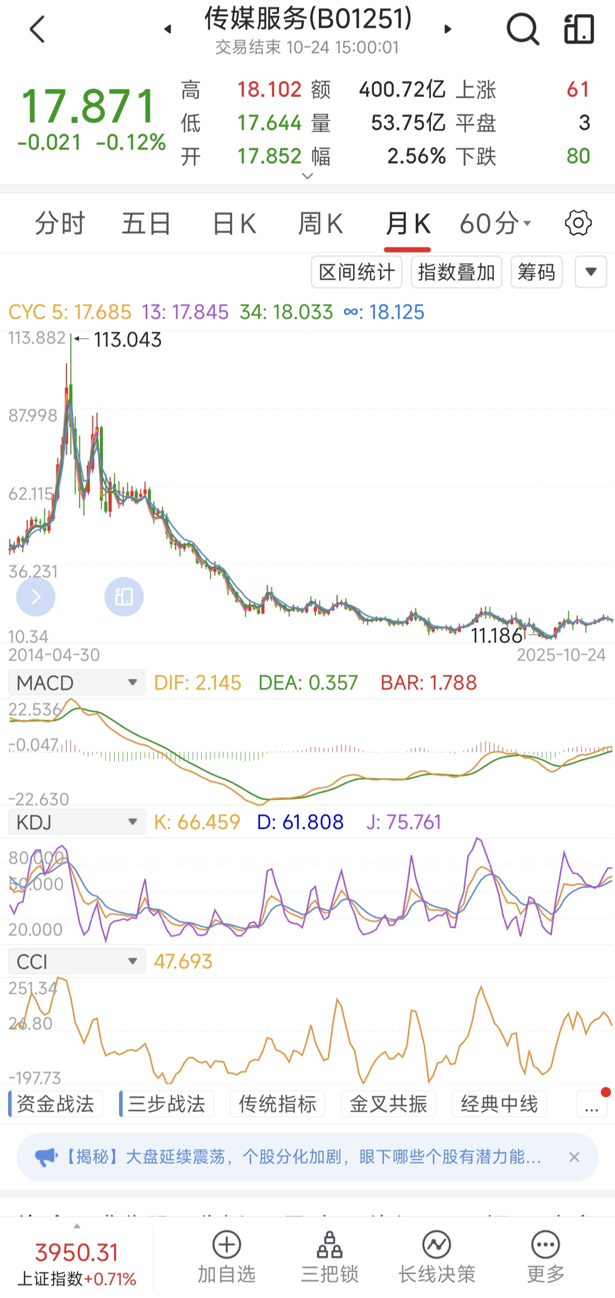 高低切换,传媒服务还在低位,值得关注。钓鱼的过程中需要耐心和冷静,放长线钓大鱼更
