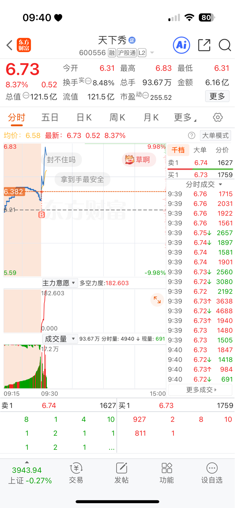 $天下秀(SH600556)$ 集合竞价直接挂涨停价买入,感觉吃亏了