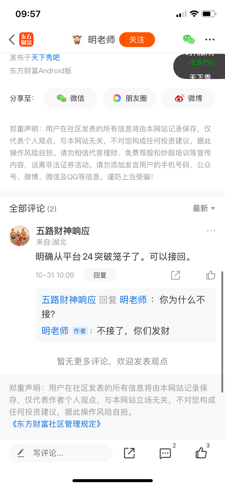 温馨提示: 1.根据《证券法》规定,禁止编造、传播虚假信息或者误导性信息,扰乱证券市场;2.用户在本社区发表的所有资料、言论等仅代表个人观点,与本网站立场无关,不对您构成任何投资建议。用户应基于自己的独立判断,自行决定证券投资并承担相应风险。《东方财富社区管理规定》