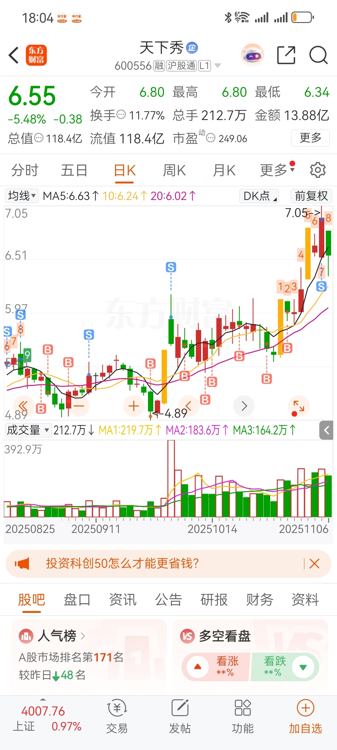 $天下秀(SH600556)$ 7元这个位置分歧太大,最近一直放量,感觉不正常,先出来看看,形势明朗了再进去