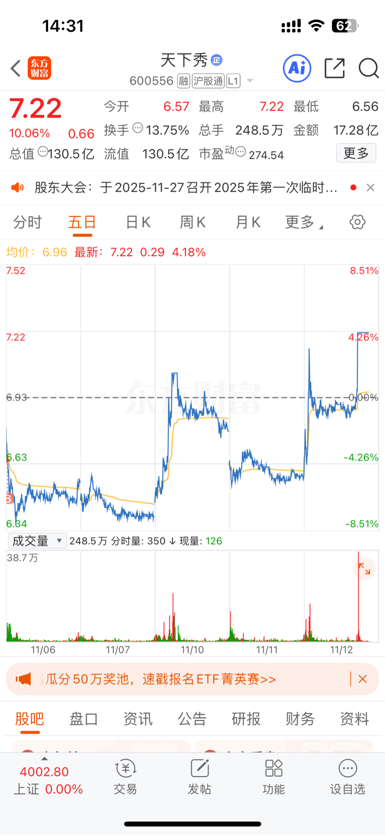 $天下秀(SH600556)$ 这个仓位太小就不卖了