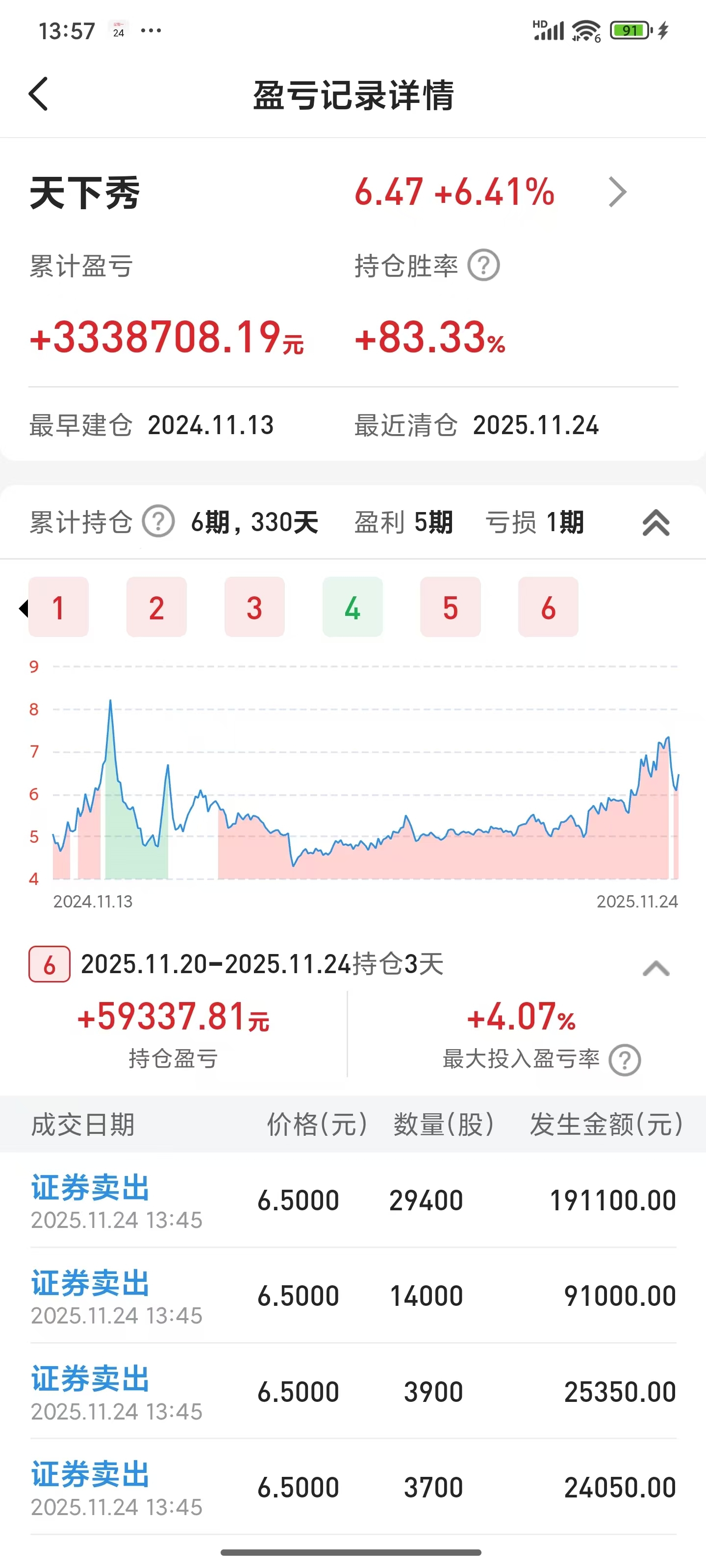 感谢天下秀主力,刚刚走了留下发财,之前发过帖子,超跌反弹每一次加一层仓策略,赚了