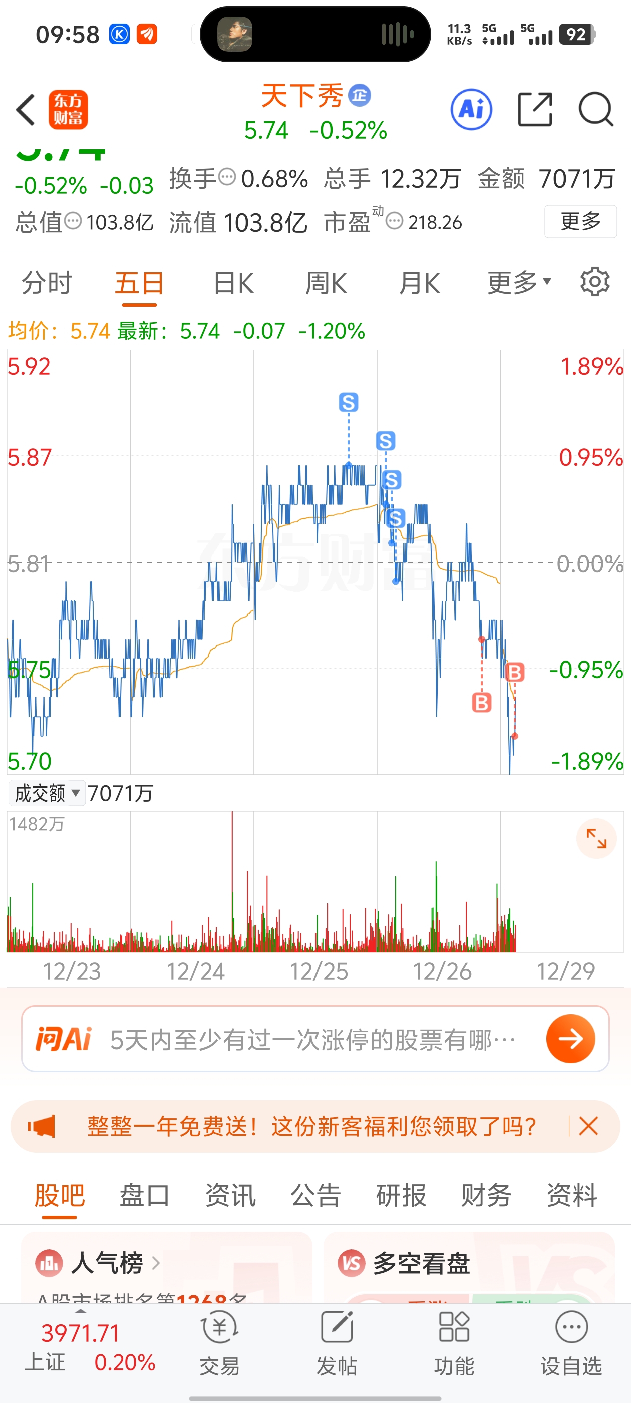 $天下秀(SH600556)$ 5.8以上就卖,5.8以下就买,看谁能耗