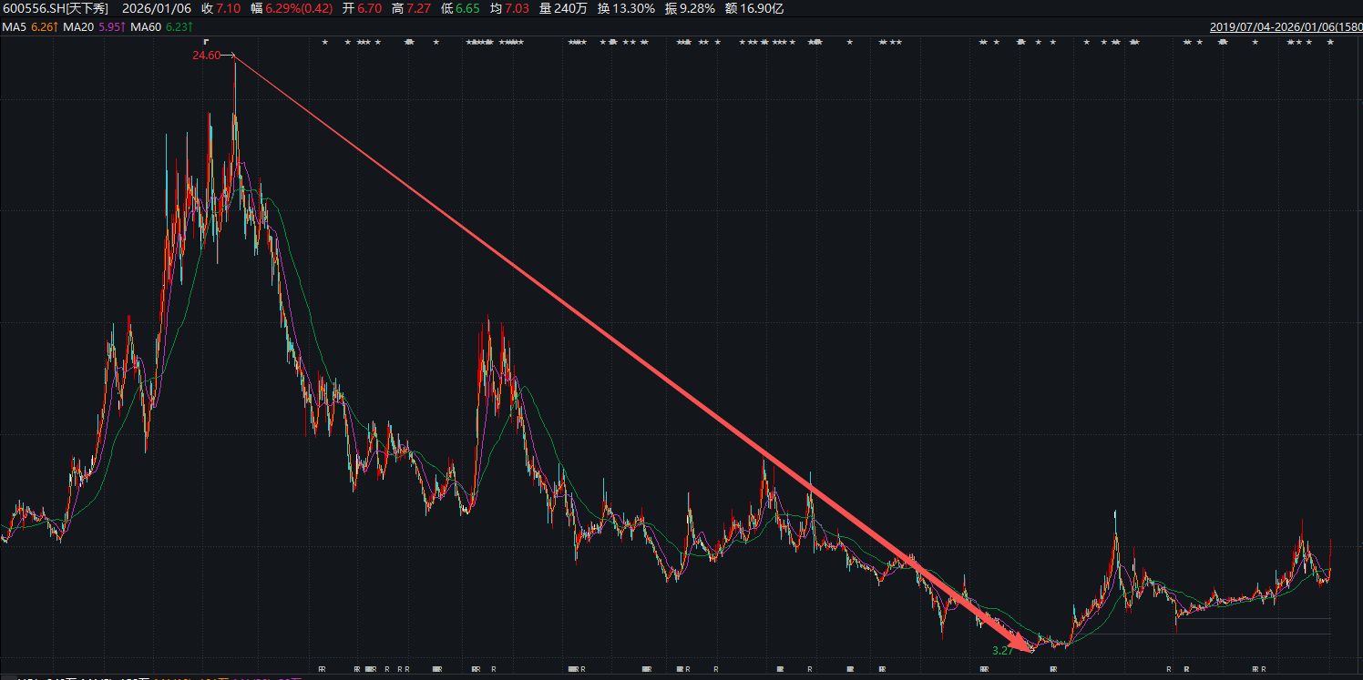 上市初期的2020年8月,天下秀盘中一度创下24.6元的高点。然而,随后天下秀股价开启了长达数年的震荡下行,并在2024年7月创下3.27元的低点,最大累计跌幅达86.54%。尽管2024年7月见底后天下秀A股股价有所反弹,但距离24.6元的高点仍相差甚远。