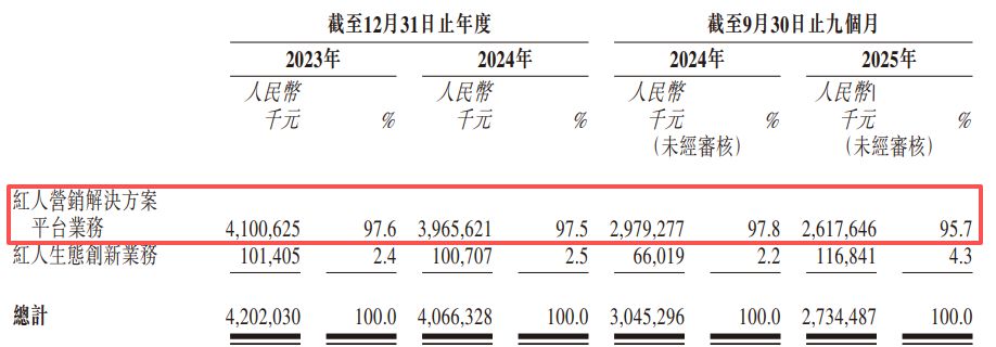 天下秀主营业务分为红人营销解决方案平台业务以及红人经济生态链创新业务,其中,前者为公司的主要收入来源,通过公司主要的专有平台WEIQ,为广告主客户提供红人营销解决方案。具体来看,2023年、2024年和2025年前三季度(下称“报告期内”),天下秀来自红人营销解决方案平台业务的收入占比分别为97.6%、97.5%和95.7%。