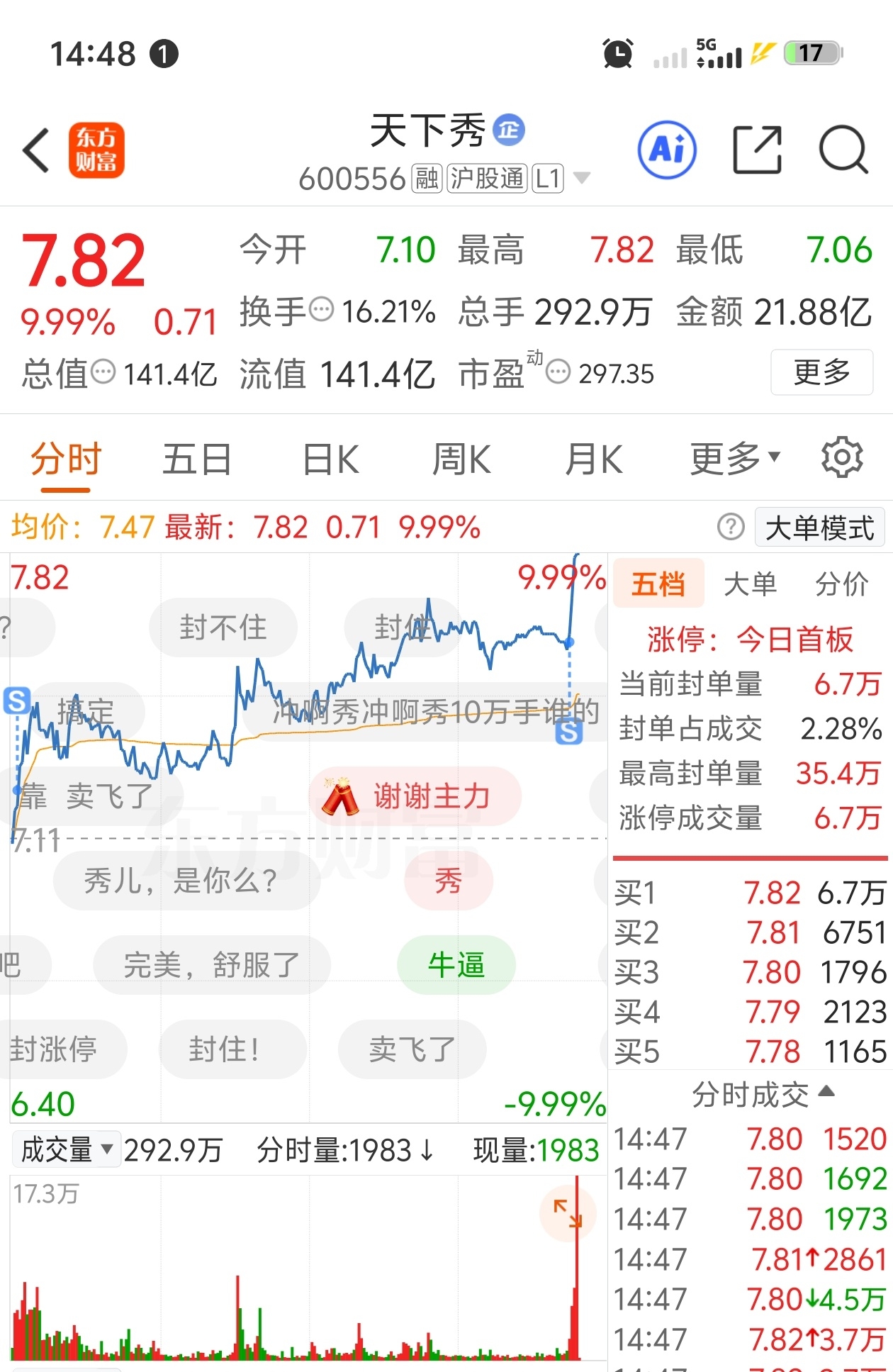 $天下秀(SH600556)$ 就等我,主力等了我一天