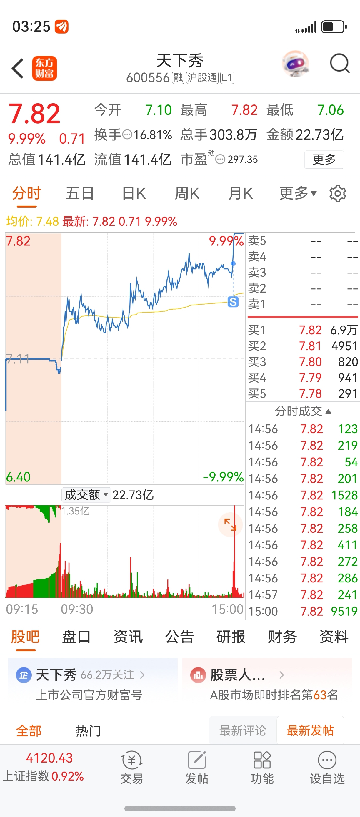 $天下秀(SH600556)$ 我卖完你就拉涨停,你就差我这仨瓜俩枣?