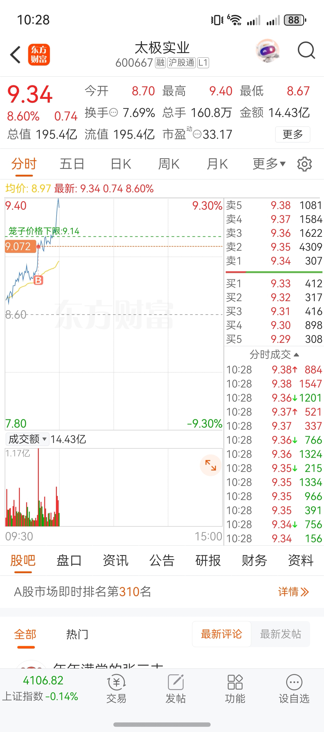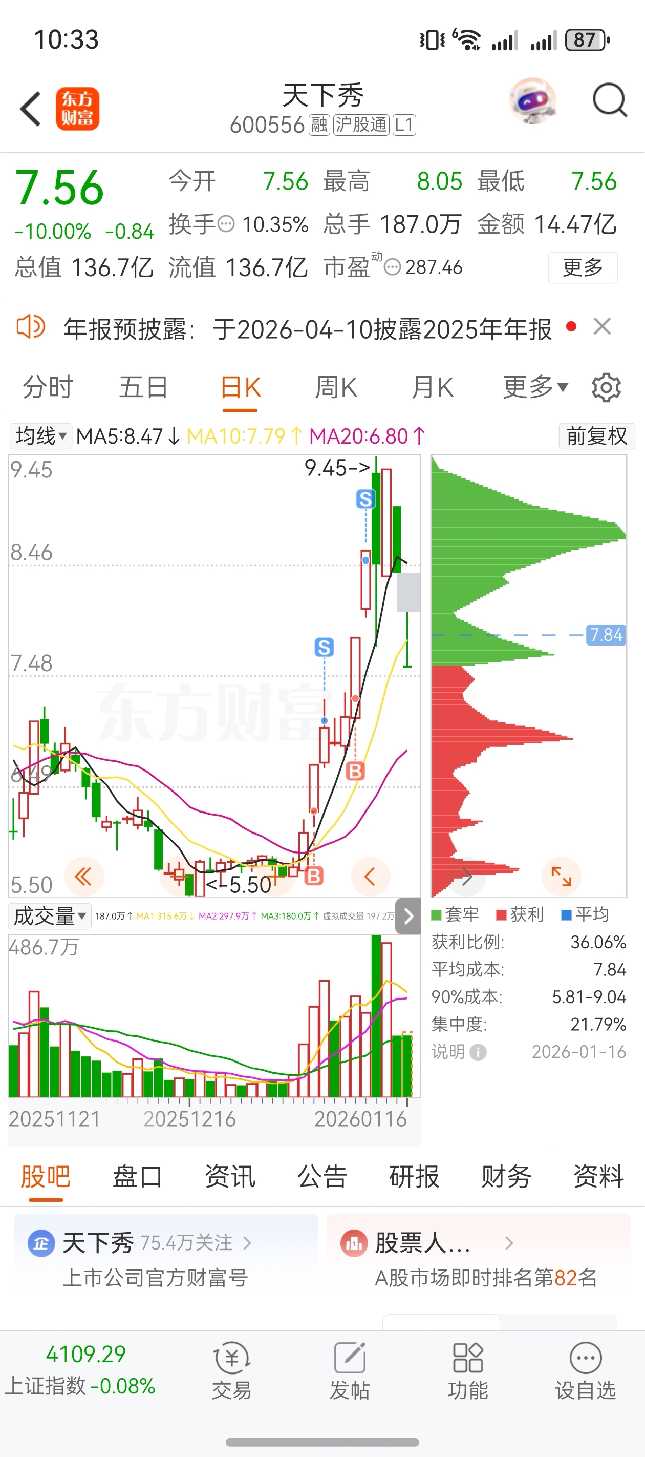 $天下秀(SH600556)$ 还有这么多家人坚守啊,我只挣认知内的钱,不盲目追涨杀跌,秀儿早跑了,去实达挣了点昨天出了昨天反手进了合肥城建,今天高点又出了反手又进了太极,家人们你们继续坚守,秀儿我过几天再来陪你们。
