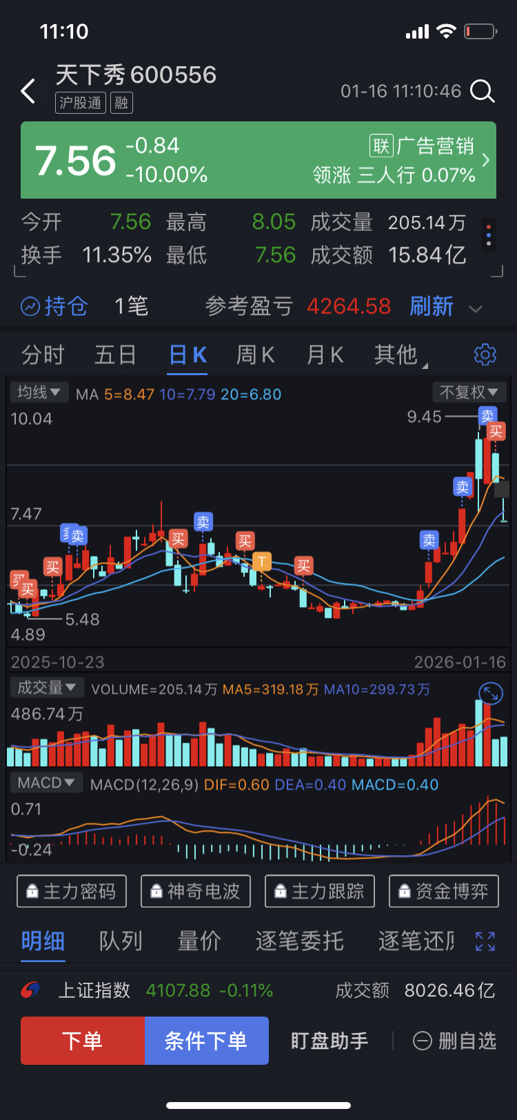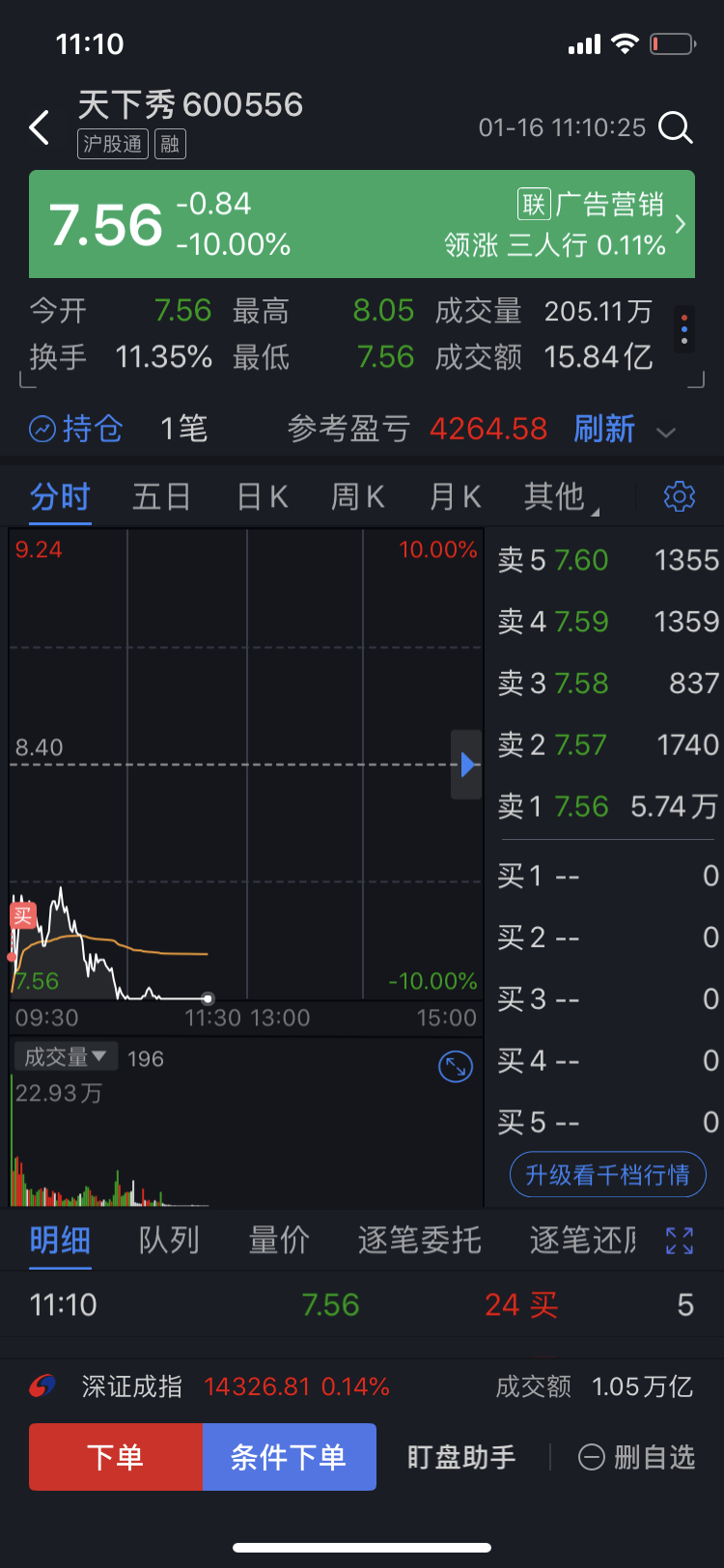 $天下秀(SH600556)$ 昨天跌停板买入抄底,今天吃了一个地板;今天继续跌停板买入抄底,下周一有种继续跌停板;下周一如果跌停就继续买入抄底。