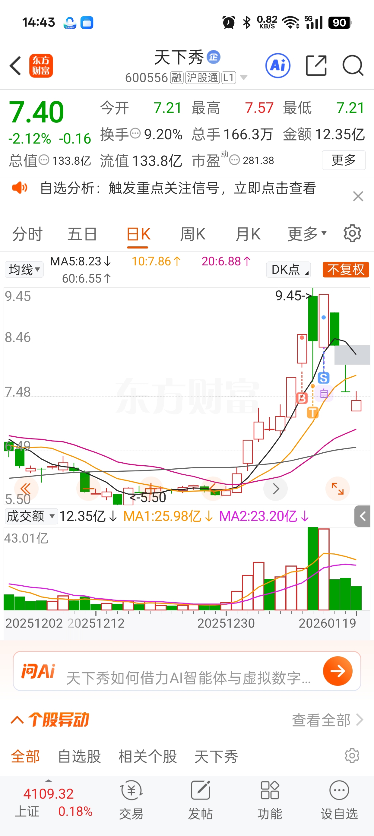 $天下秀(SH600556)$ 我反正是早跑了