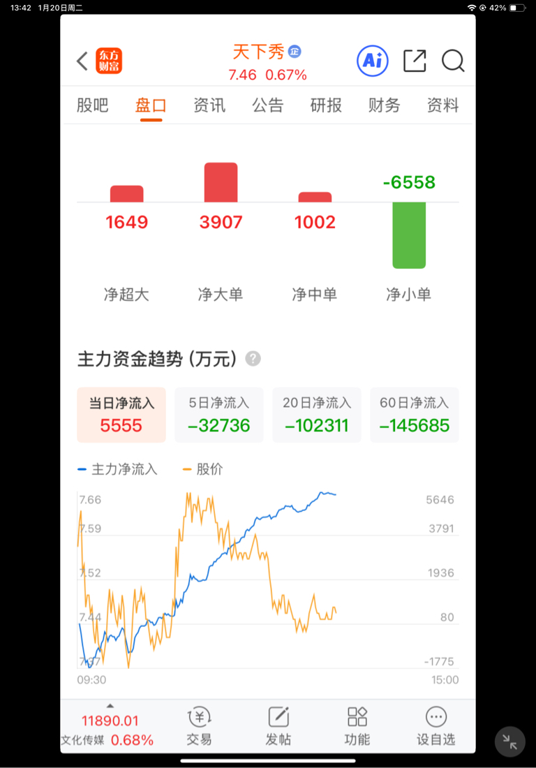 $天下秀(SH600556)$ 一直净流入。主力加油