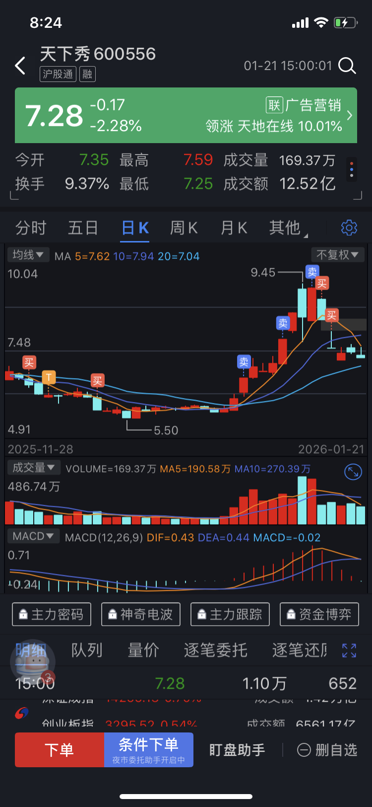 $天下秀(SH600556)$ 总感觉这支票的涨行情还未走完,手痒又加了2笔仓。