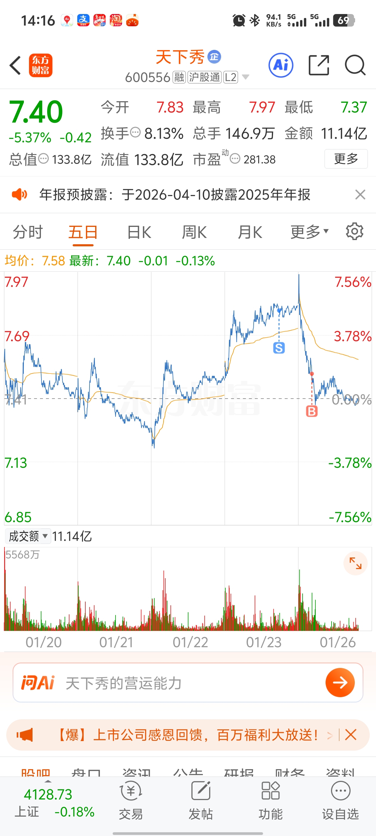 $天下秀(SH600556)$ 大意了,想不到这个飞舞奔跌停去了