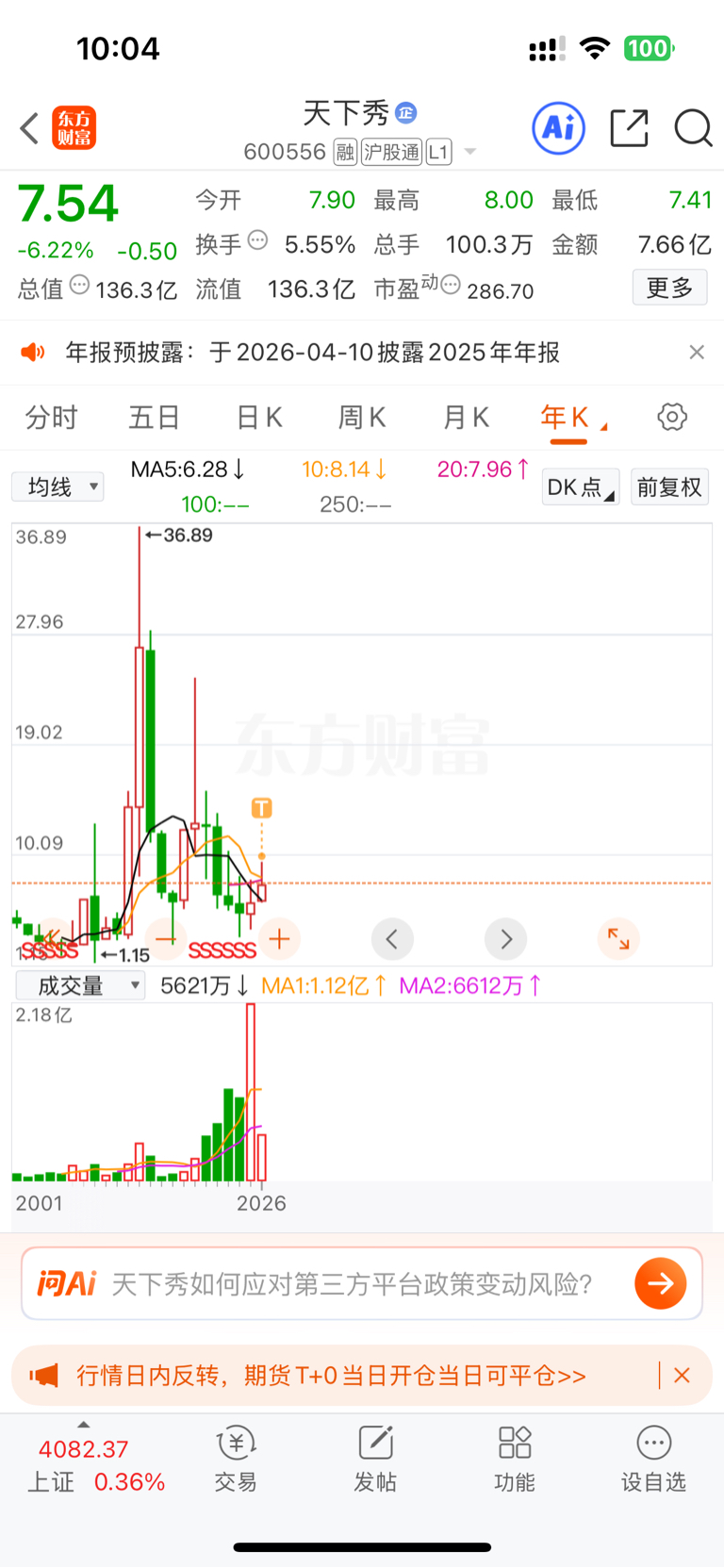 $天下秀(SH600556)$ 上一年的成交量这么大,就为了涨这么一点?反正我不信
