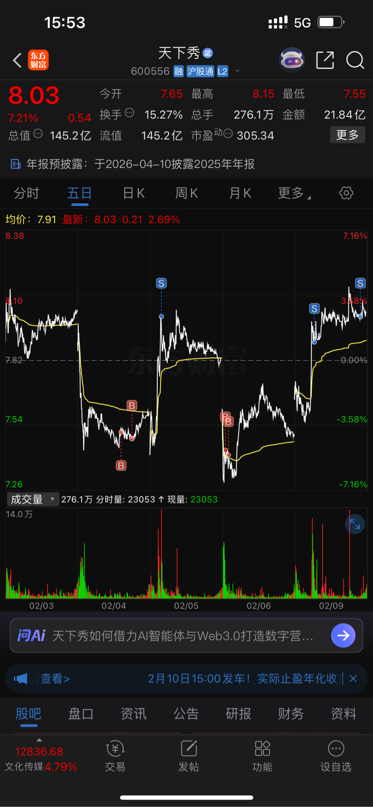 $天下秀(SH600556)$ 管他明天怎么样 反正吃的满嘴流油了