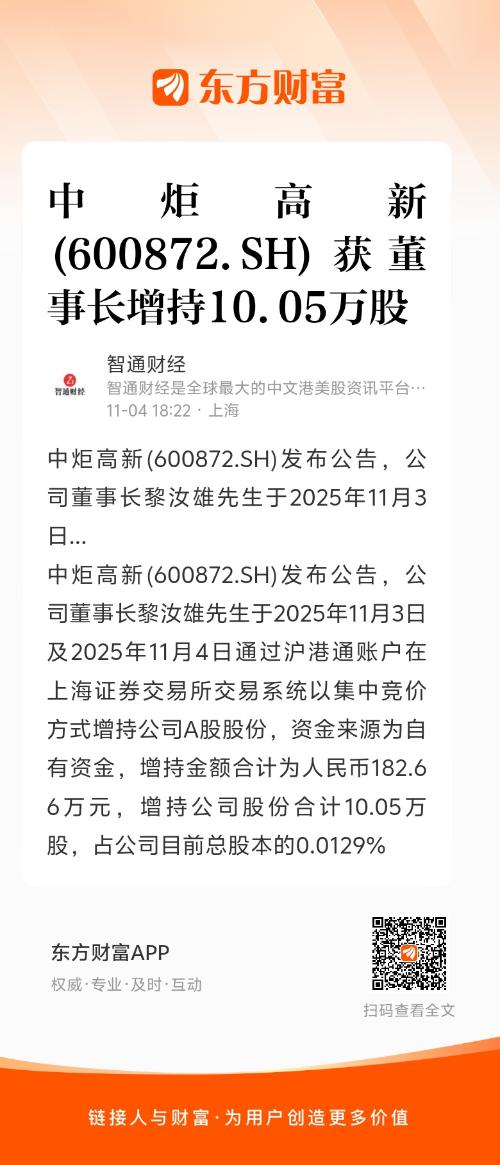 中炬高新(600872.SH)发布公告,公司董事长黎汝雄先生于2025年11月3日及2025年11月4日通过沪港通账户在上海证券交易所交易系统以集中竞价方式增持公司A股股份,资金来源为自有资金,增持金额合计为人民币182.66万元,增持公司股份合计10.05万股,占公司目前总股本的0.0129%
