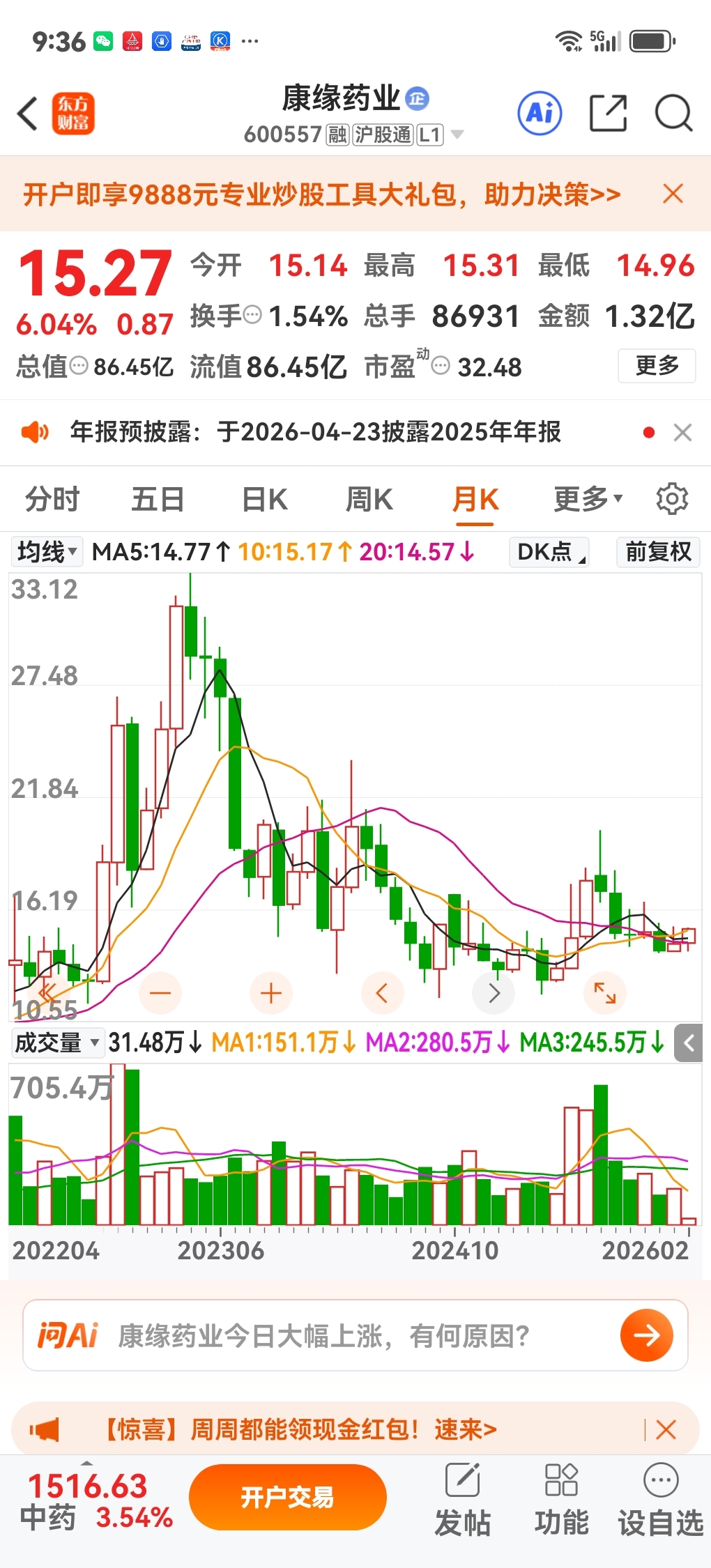 $康缘药业(SH600557)$ 可以涨了吗,套我半年了