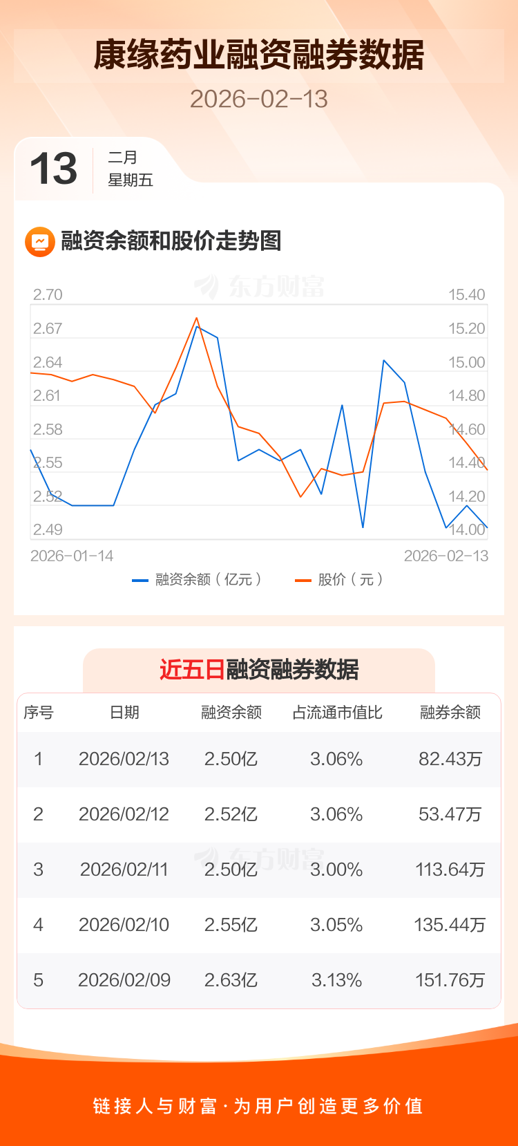 交易所最新数据显示,康缘药业于2026年2月13日获融资买入503.37万元,融资偿还745.63万元,当日融资净偿还242.26万元。目前,该股融资余额2.50亿,占流通市值比例为3.06%。