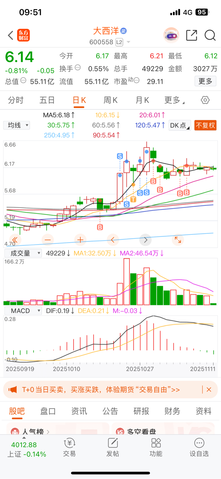 看这走势,要不要调仓去亚邦,昨天亚邦买了底,今天收盘再上不去就换掉,大西洋太弱了