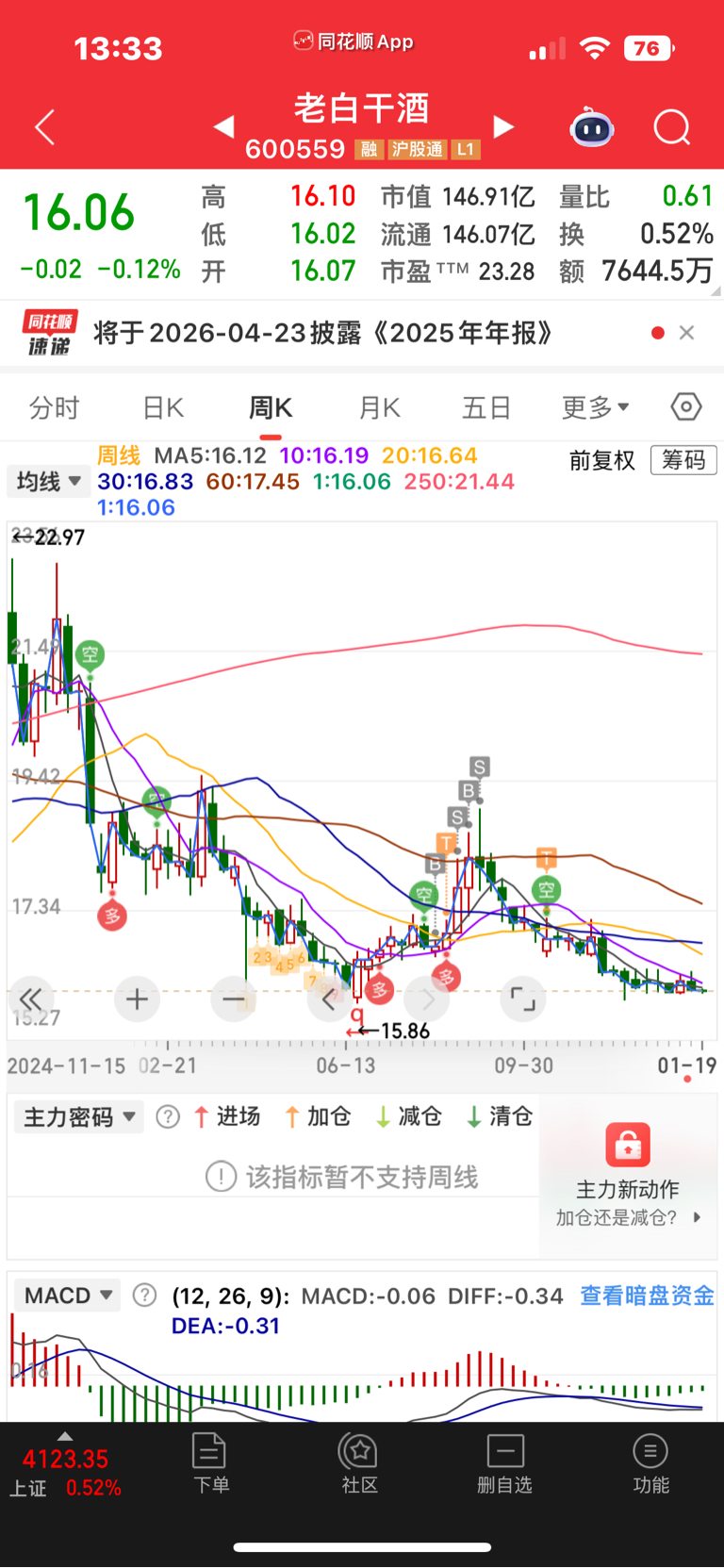 $老白干酒(SH600559)$ 15.9接回。