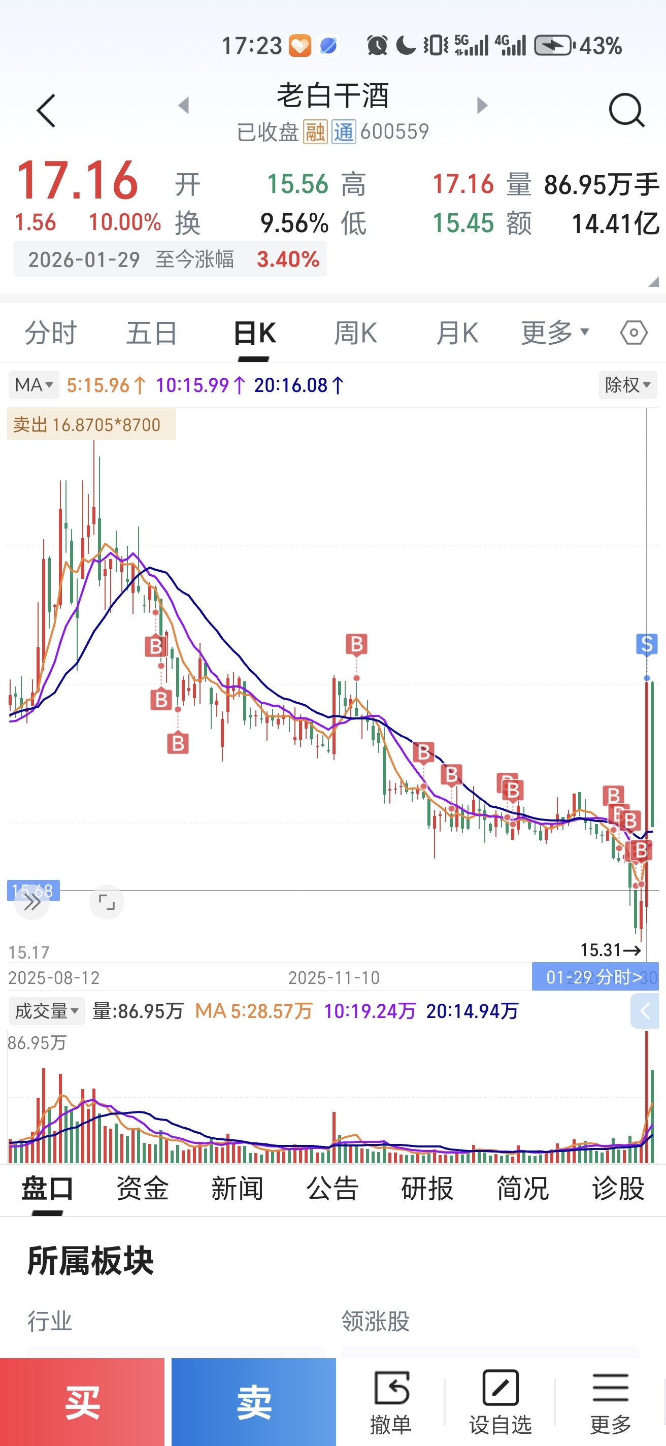 $老白干酒(SH600559)$ 别人贪婪我恐惧,别人恐惧我贪婪,股票果然是反人性的东西!昨天8个多点全抛了,本来很懊悔卖早了,结果今天一日游,还是严守自己的交易规则,上涨时候卖的,下跌是买的。不要被情绪左右。#收盘点评# #炒股日记# #复盘记录# #实盘记录# 准备近几天分次再进。坐等吃肉。
