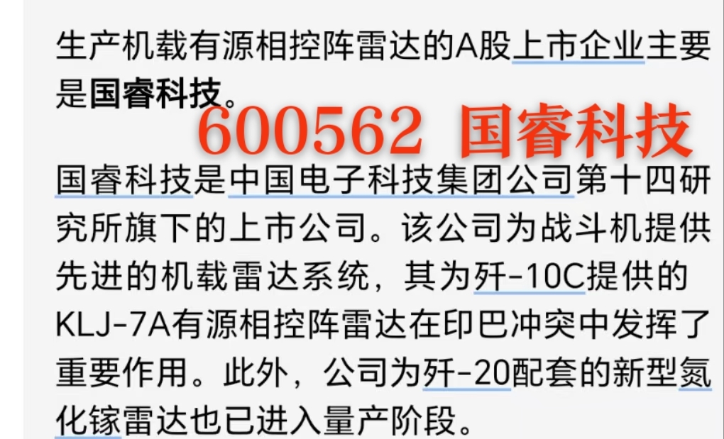 印巴冲突大题材$国睿科技(SH600562)$ 生产机载有源相控阵雷达的A股上市企业主要是国睿科技。