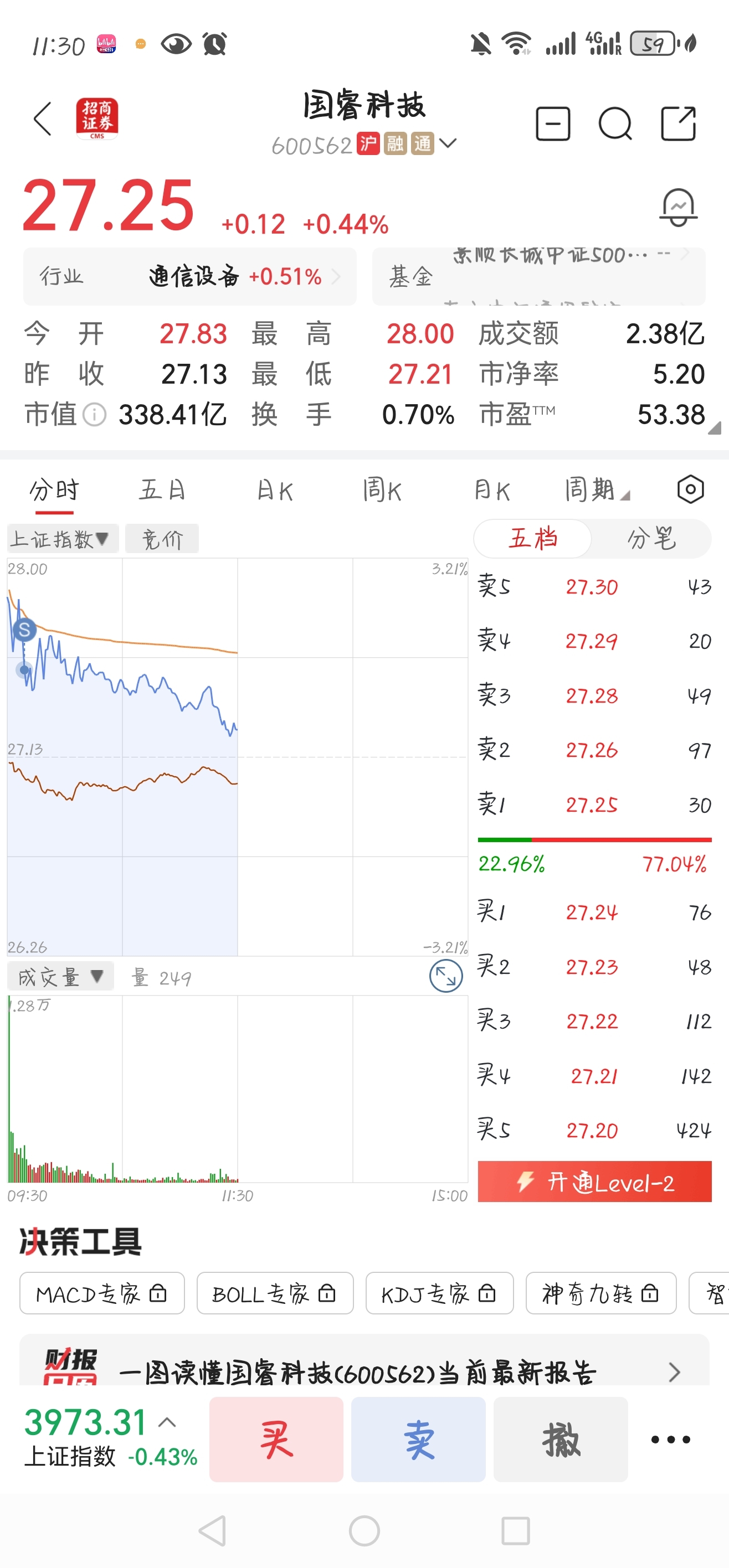 $国睿科技(SH600562)$ 26.98的本,等了这么多天没动,主力一直在跑,还是不拿了,赚一点也走了#炒股日记#