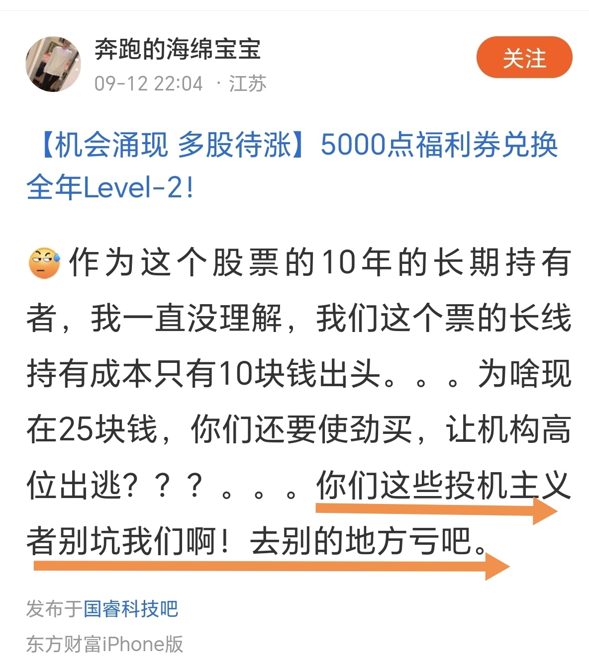 $国睿科技(SH600562)$ 股吧里有个叫,奔跑的海绵宝宝…没事就在这里妖言惑众,说一堆自大的发言,目的何在呢?大家自己看吧,他9月份发的言…仔细看看写的,我相信每个正常人都看的懂他的目的了,所以都别搭理这个人…这个人私心太坏了