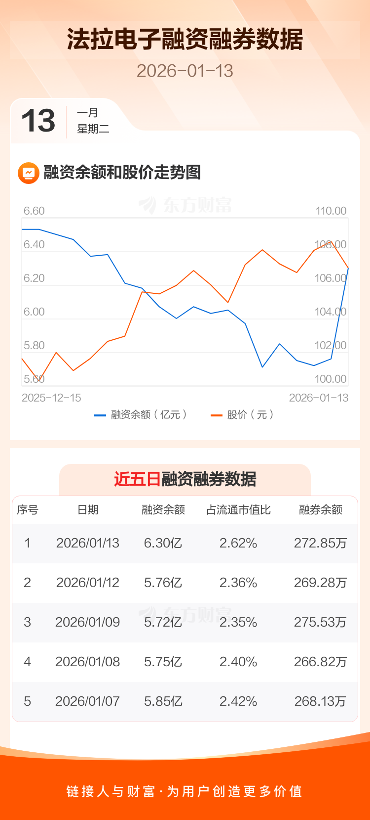 交易所最新数据显示,法拉电子于2026年1月13日获融资买入1.01亿元,融资偿还4623.33万元,当日融资净买入5456.72万元。目前,该股融资余额6.30亿,占流通市值比例为2.62%。